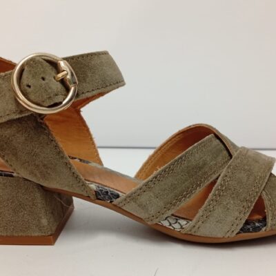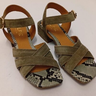 El precio original era: 69,95 €.55,96 €El precio actual es: 55,96 €.Sandalia en piel de color verde con tacón de 4 cm, puntera cuadrada imitación piel de serpiente, con cierre en el tobillo mediante hebilla .