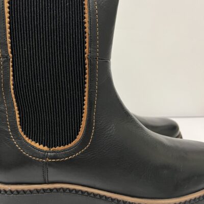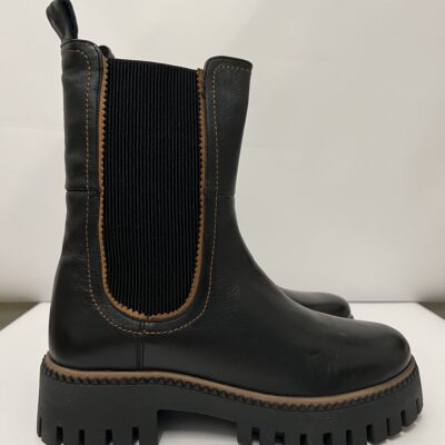 El precio original era: 145,00 €.116,00 €El precio actual es: 116,00 €.Bota de piel en color negro con elástico y tacón de 6cm.