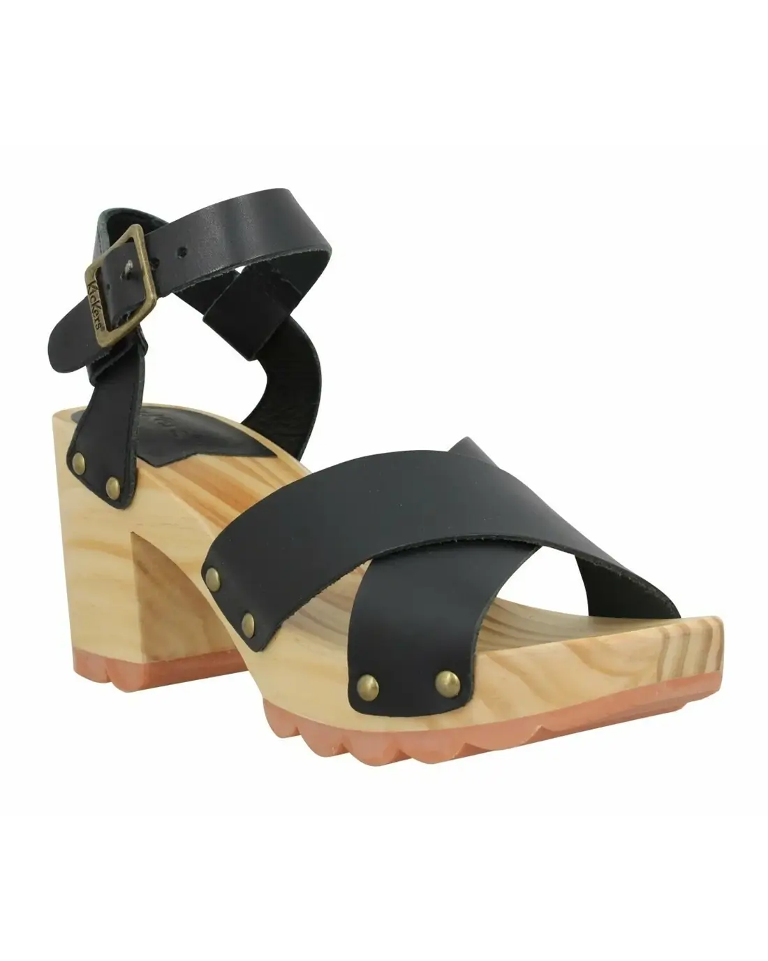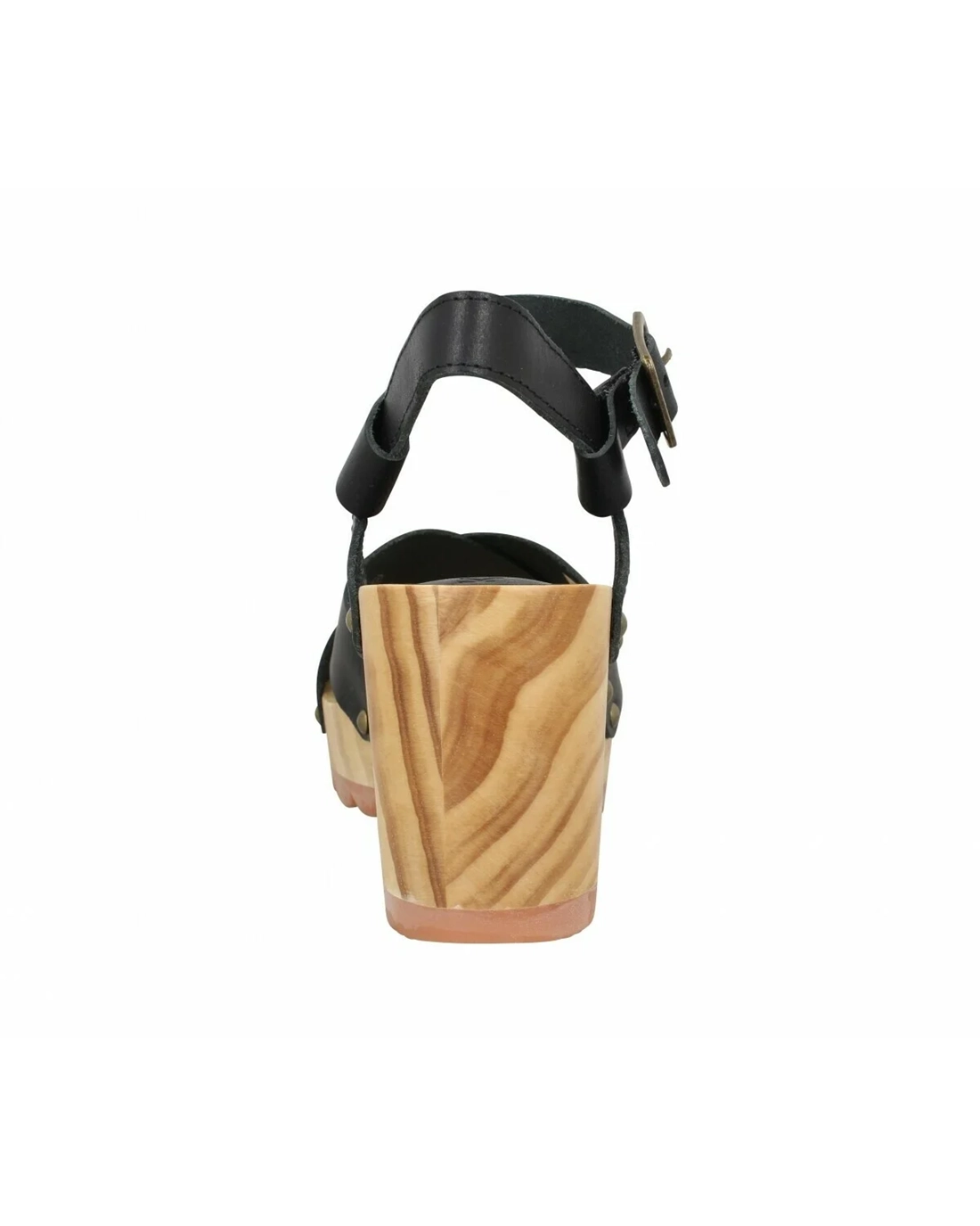 Sandalias para mujer con un forro de cuero de color negro y tacón de madera. Estas sandalias te garantizan comodidad y robustez gracias a su plantilla en 80% madera y 20% cuero y su suela exterior en goma. Se adapta a los pies de todas las mujeres con su cierre de hebillas.
